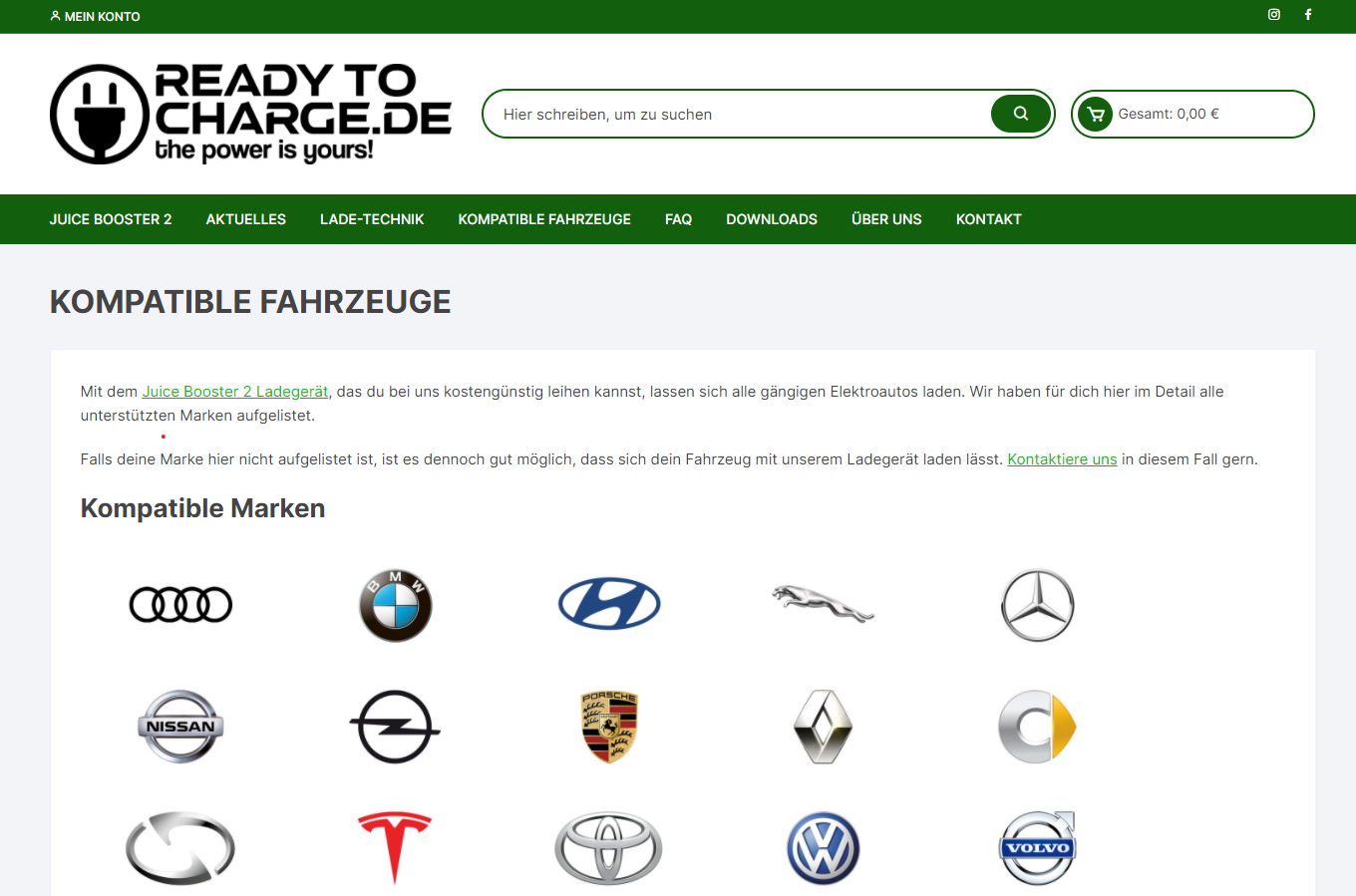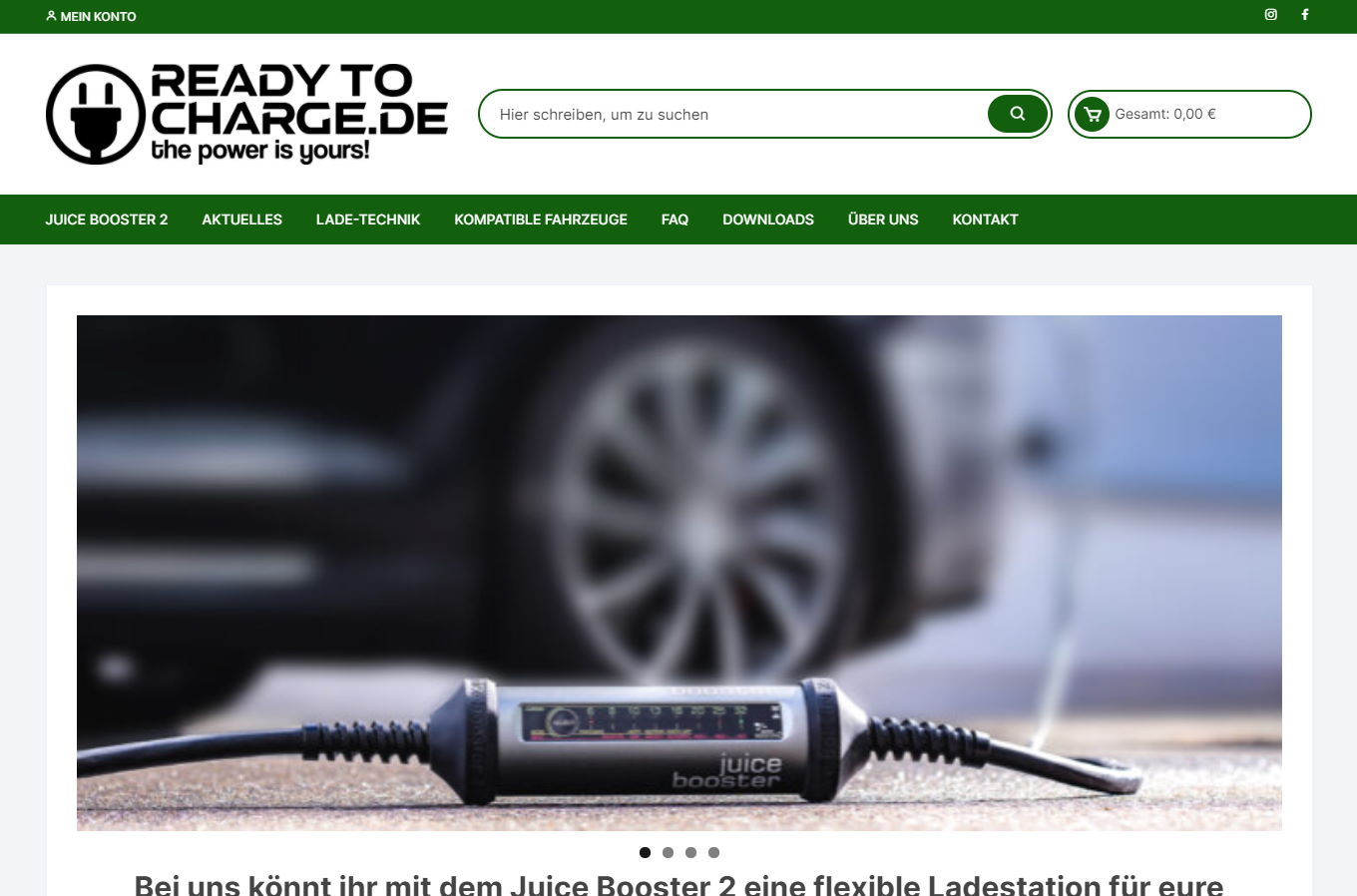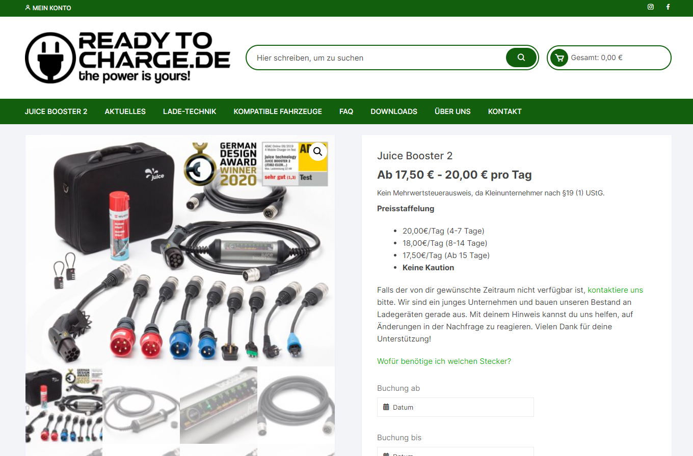 Die Webseite www.readytocharge.de ist ein Projekt von Lauinger IT Solutions. Wir bieten dort den Juice Booster 2, den Marktführer mobiler Ladegeräte für Elektrofahrzeuge, zur Vermietung an. Nach Auswahl des gewünschten Zeitraums verschicken wir den Juice Booster 2 bequem als Expresssendung, selbstverständlich ohne Versandgebühr.