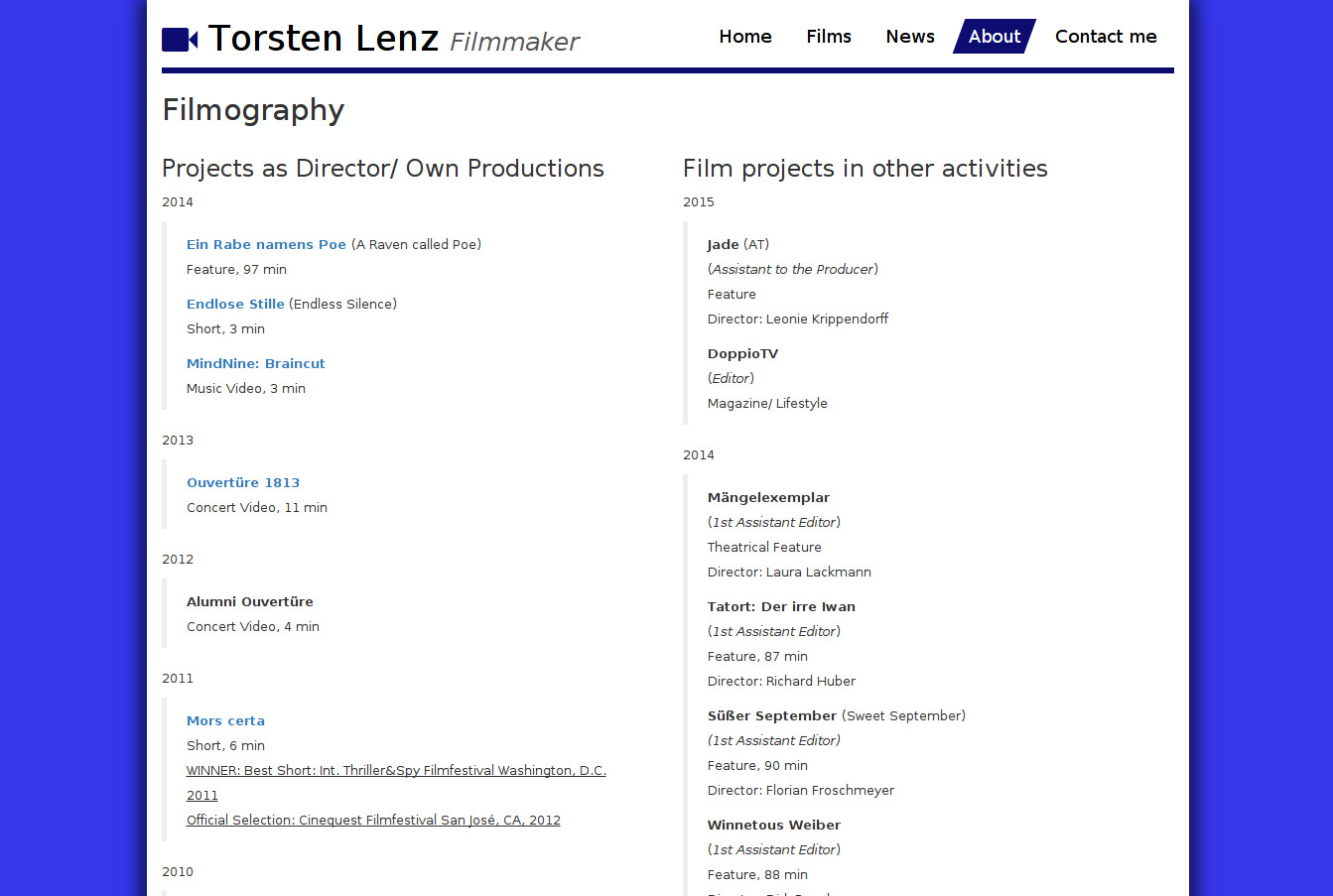 Torsten Lenz ist ein Filmemacher aus Frankfurt und arbeitet an Spielfilmen, Kurzfilmen und Musikvideos.